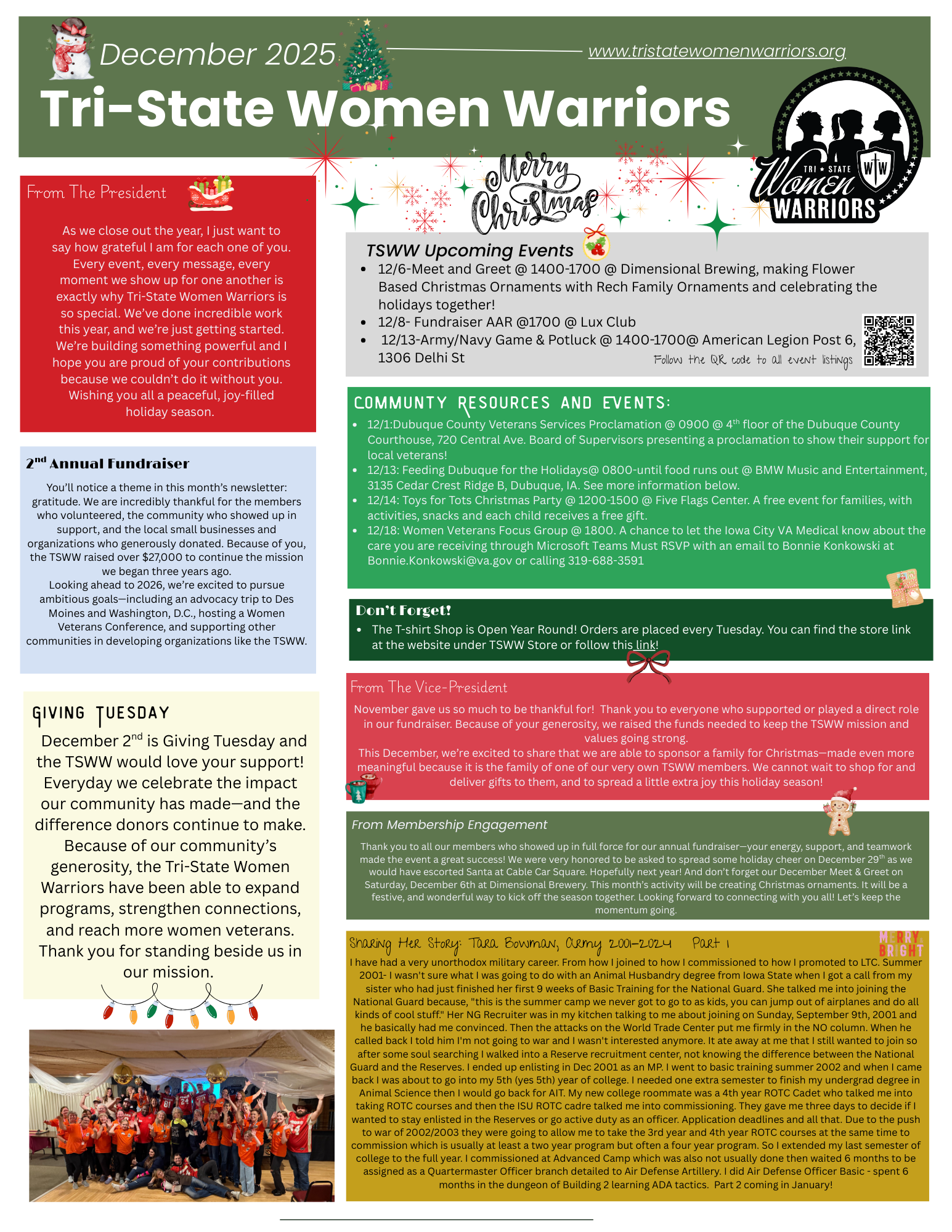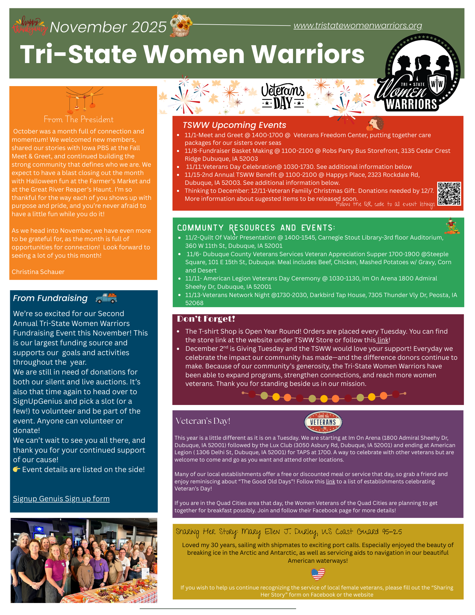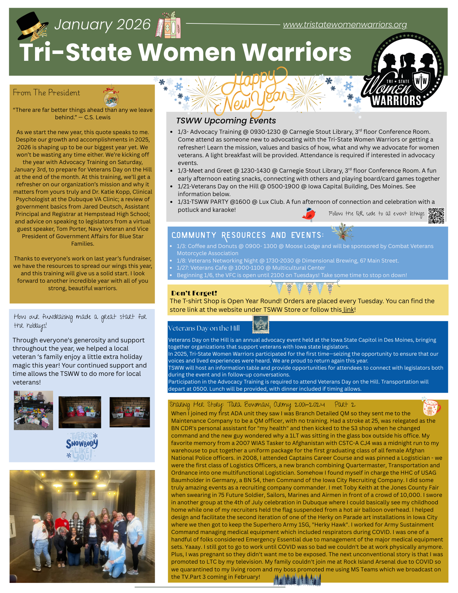 Here you can find our monthly newsletters with messages from Board Members, TSWW events, the stories of TSWW members and events that go on in our community that supports local veterans!